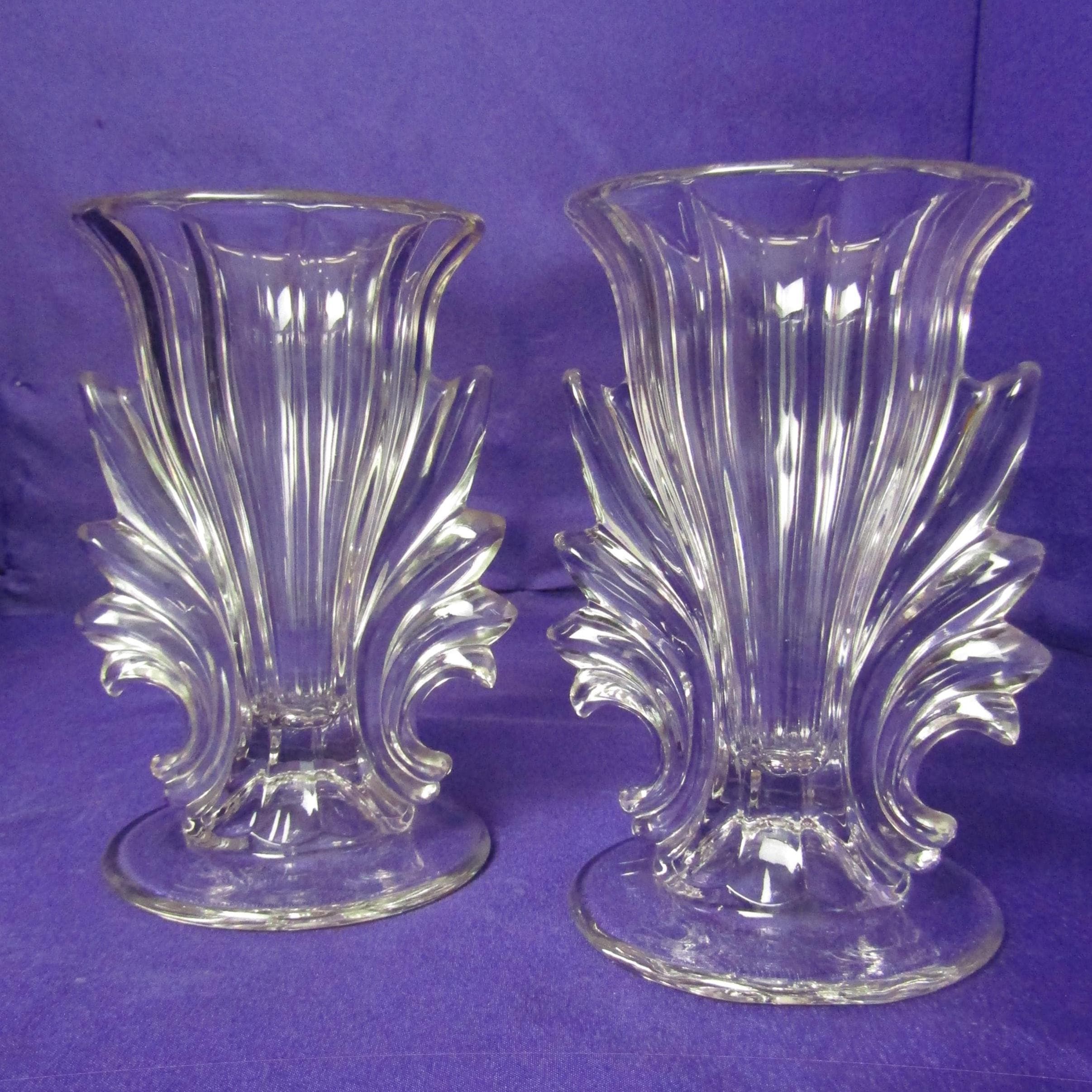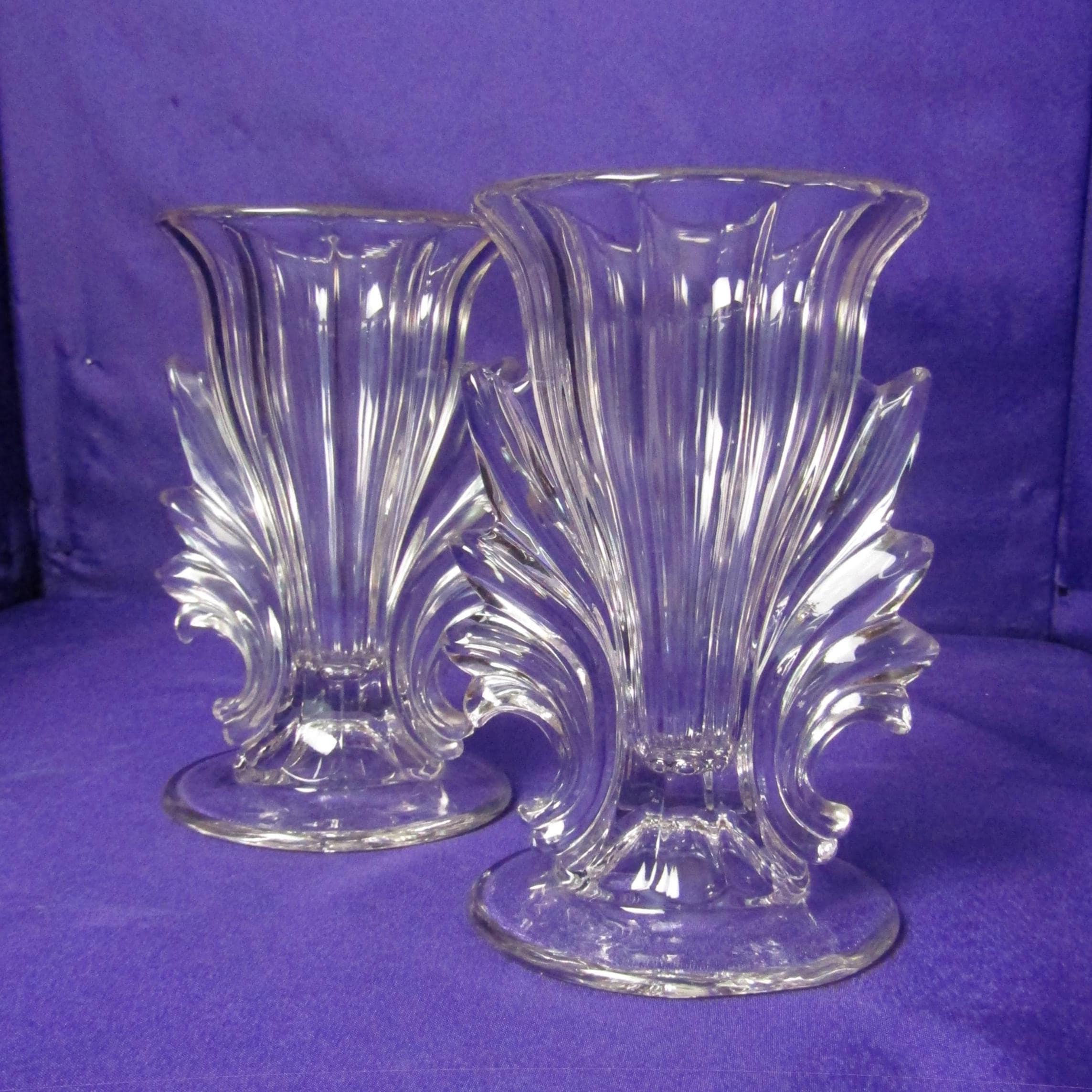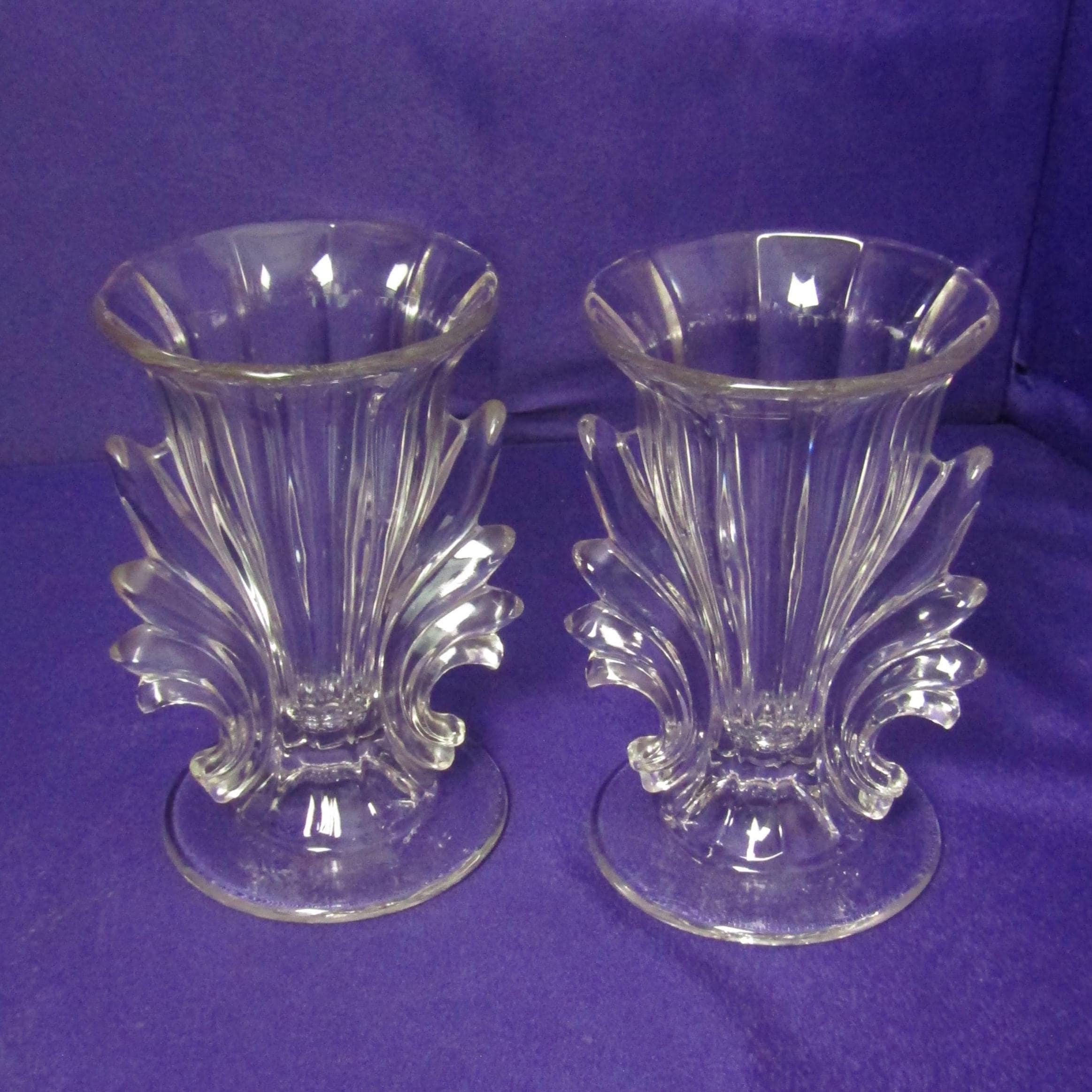Like frozen wings of light, these vintage Fostoria vases catch the eye with their graceful design and shimmering clarity. Both vases stand at 7 inches tall and have a diameter just a tad over 4 inches making them perfect for smaller bouquets, dried arrangements, or simply sparkling on their own! The vases feature wing-like handles on the sides which add a unique flair, and also an easy way to move the pair around the house. Made of a bright and clear glass, they catch the light beautifully, casting small rays and adding a bit shine wherever you decide to display them! Whether you're a seasoned collector of Fostoria glass or just looking for your next fall and winter centerpieces, these twin beauties bring both history and charm straight to your table!