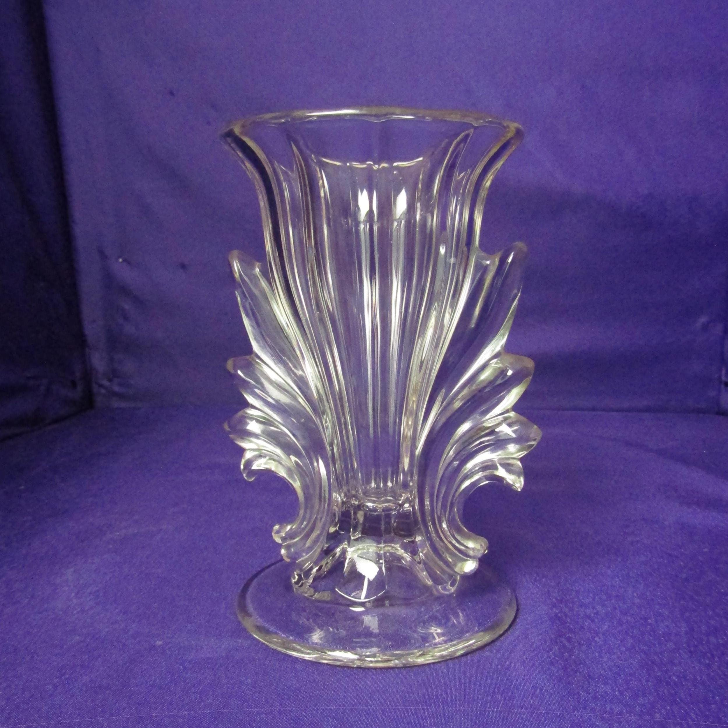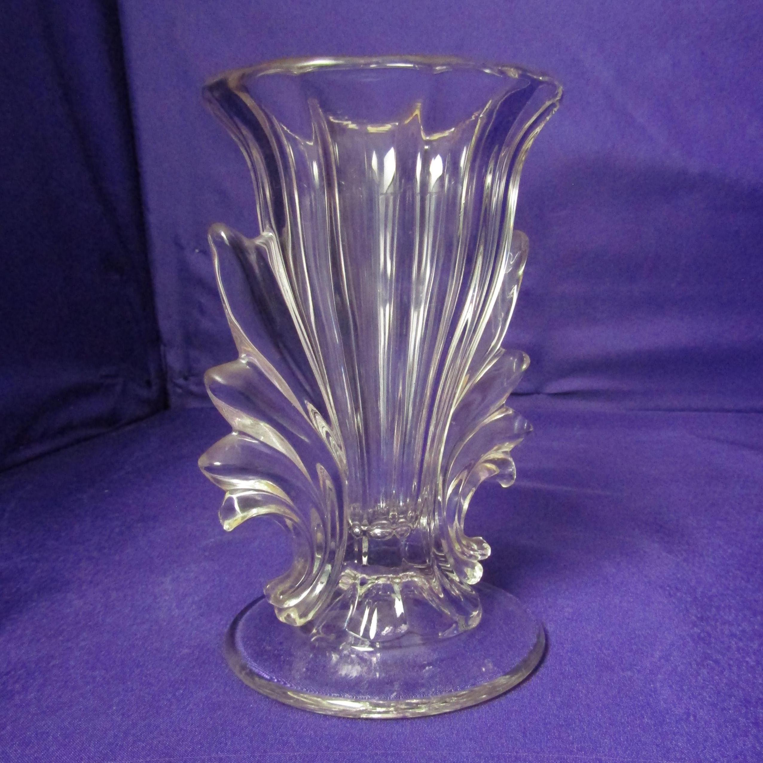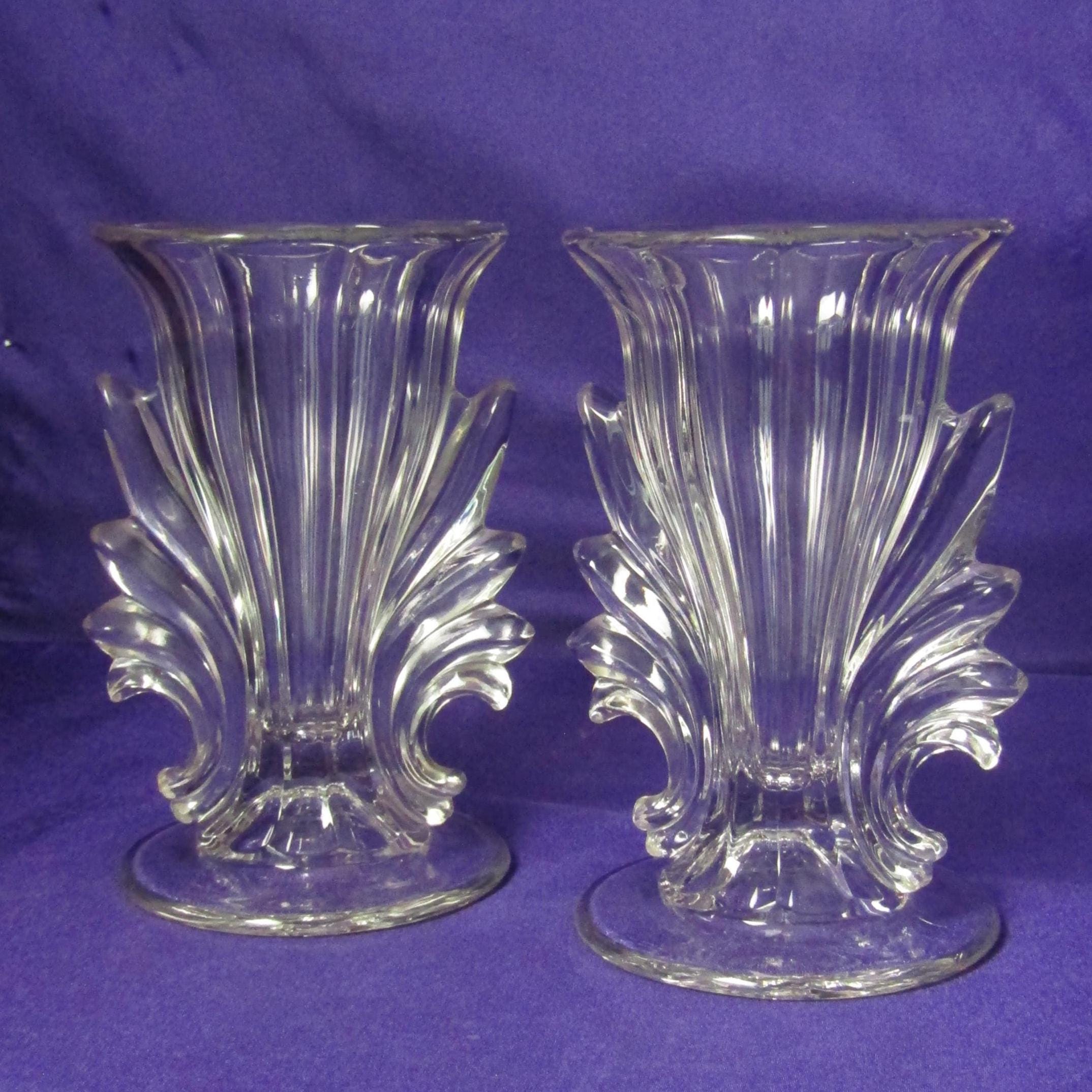 Like frozen wings of light, these vintage Fostoria vases catch the eye with their graceful design and shimmering clarity. Both vases stand at 7 inches tall and have a diameter just a tad over 4 inches making them perfect for smaller bouquets, dried arrangements, or simply sparkling on their own! The vases feature wing-like handles on the sides which add a unique flair, and also an easy way to move the pair around the house. Made of a bright and clear glass, they catch the light beautifully, casting small rays and adding a bit shine wherever you decide to display them! Whether you're a seasoned collector of Fostoria glass or just looking for your next fall and winter centerpieces, these twin beauties bring both history and charm straight to your table!