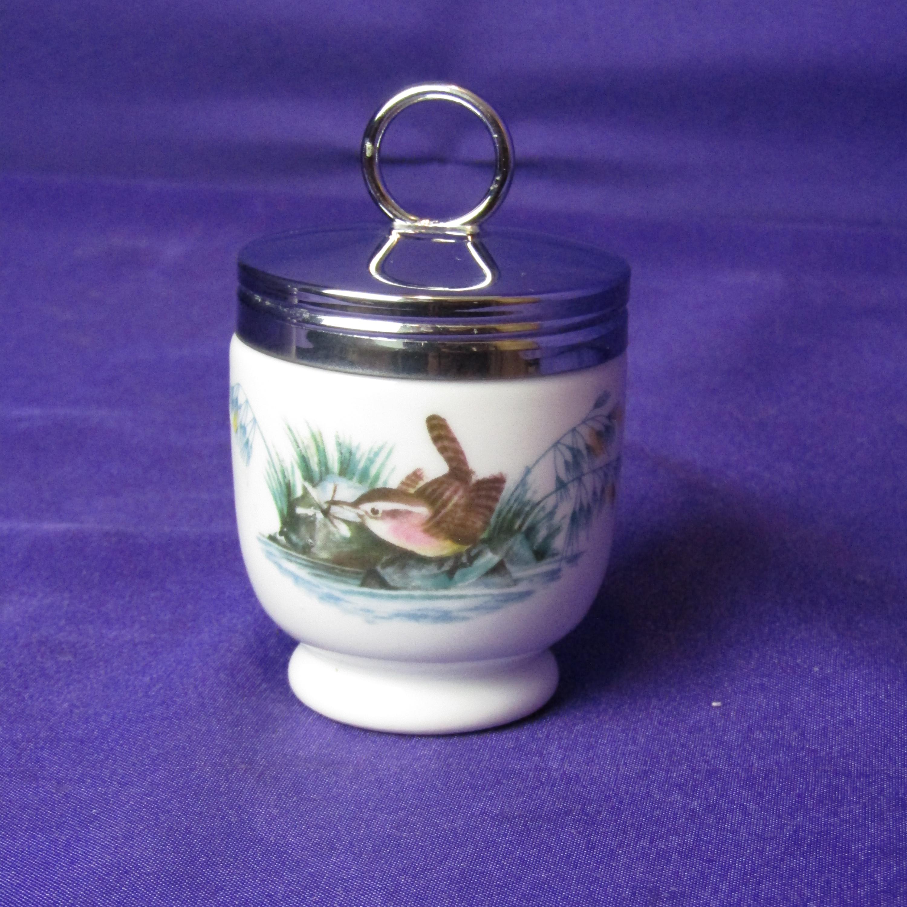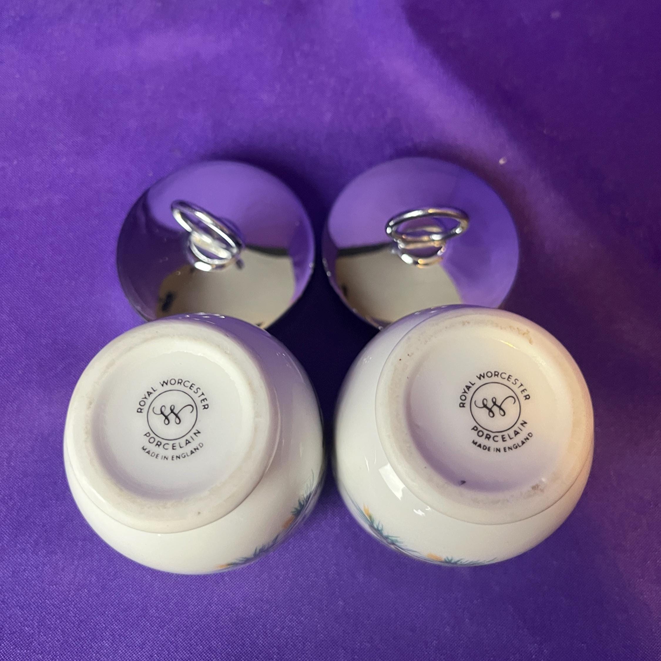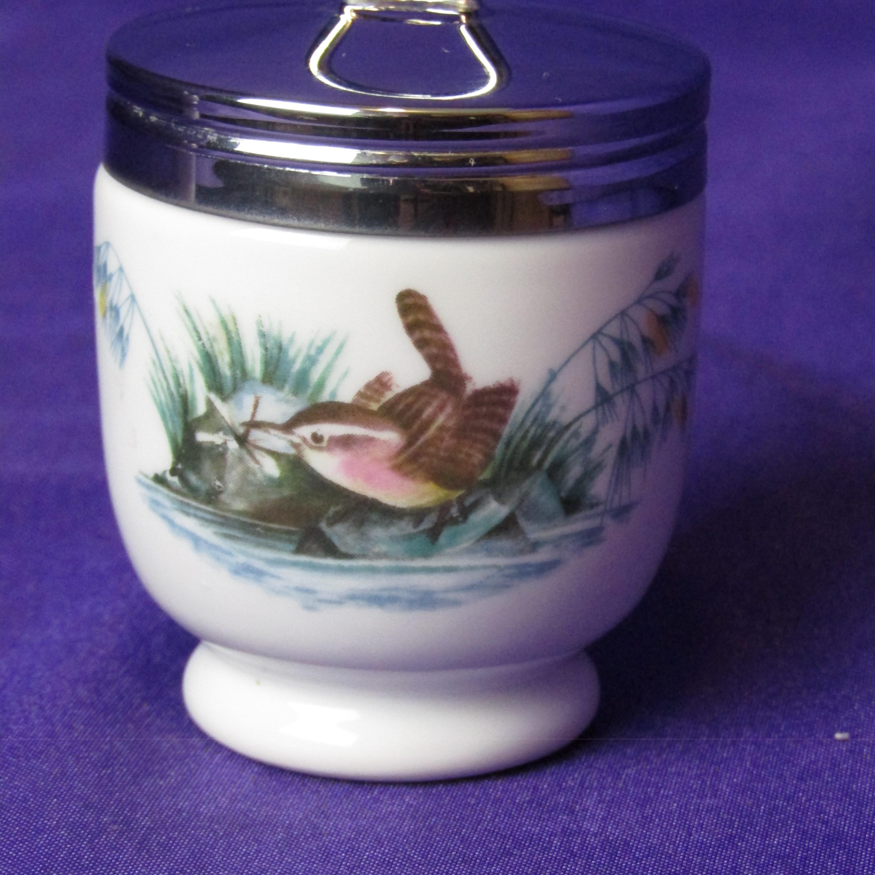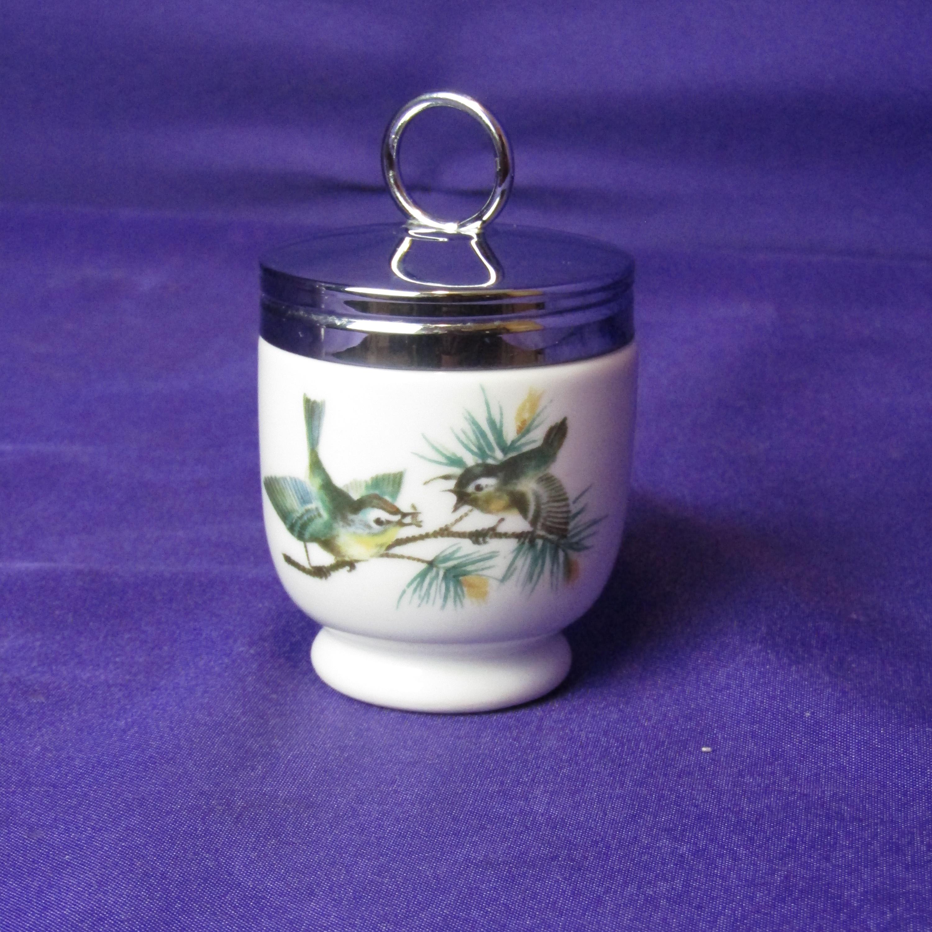 These Royal Worcester egg coddlers are a charming pair, decorated with detailed bird illustrations that give them a sweet, nature-inspired personality. One side features two delicate blue birds perched among soft greenery, while the other shows a warm-toned brown bird with fine, careful detailing. The porcelain bodies are smooth and classic in shape, topped with polished silver-tone lids and sturdy rings for easy handling. Whether displayed in a collection or used in the kitchen, these coddlers bring a touch of English tradition and gentle countryside charm to any space or table.