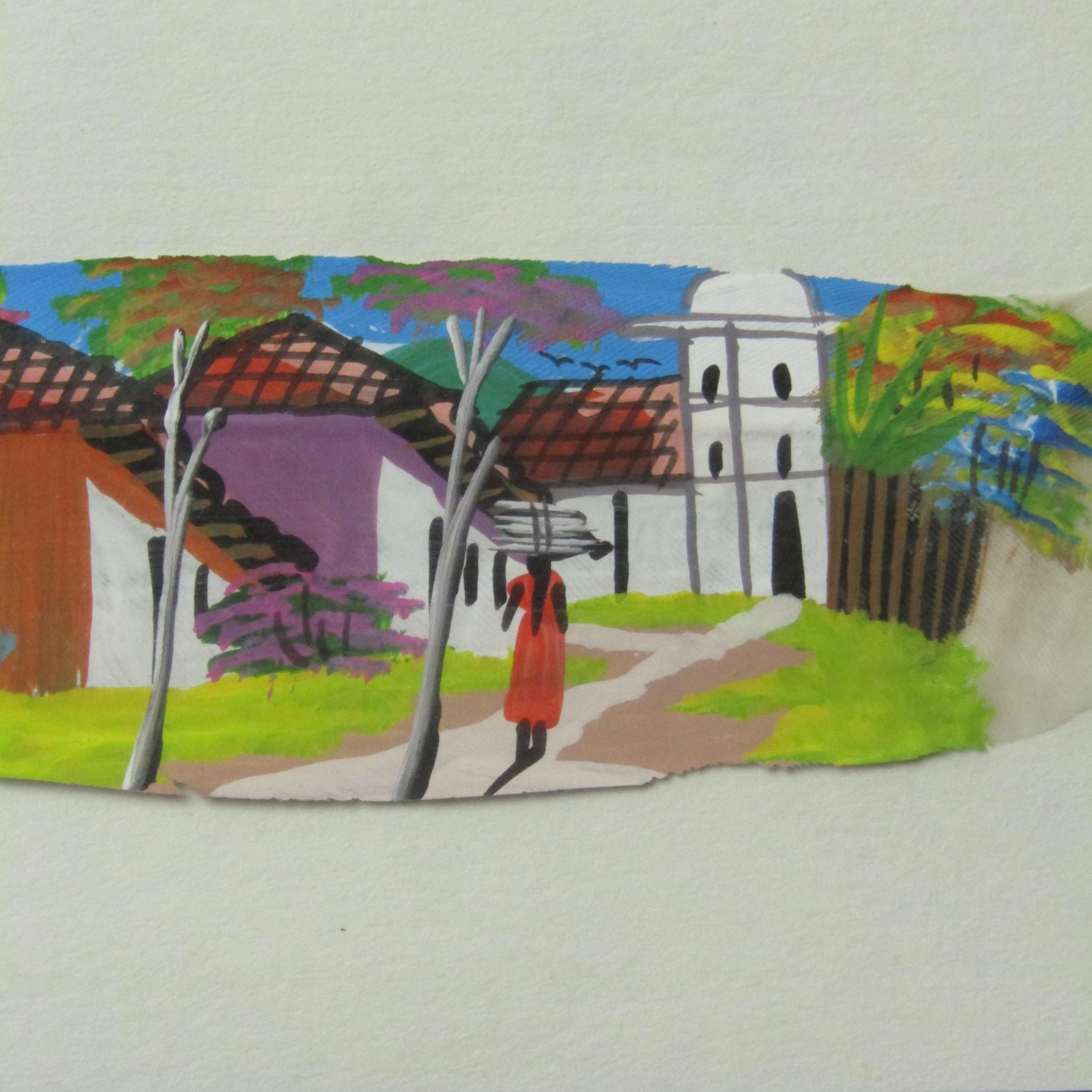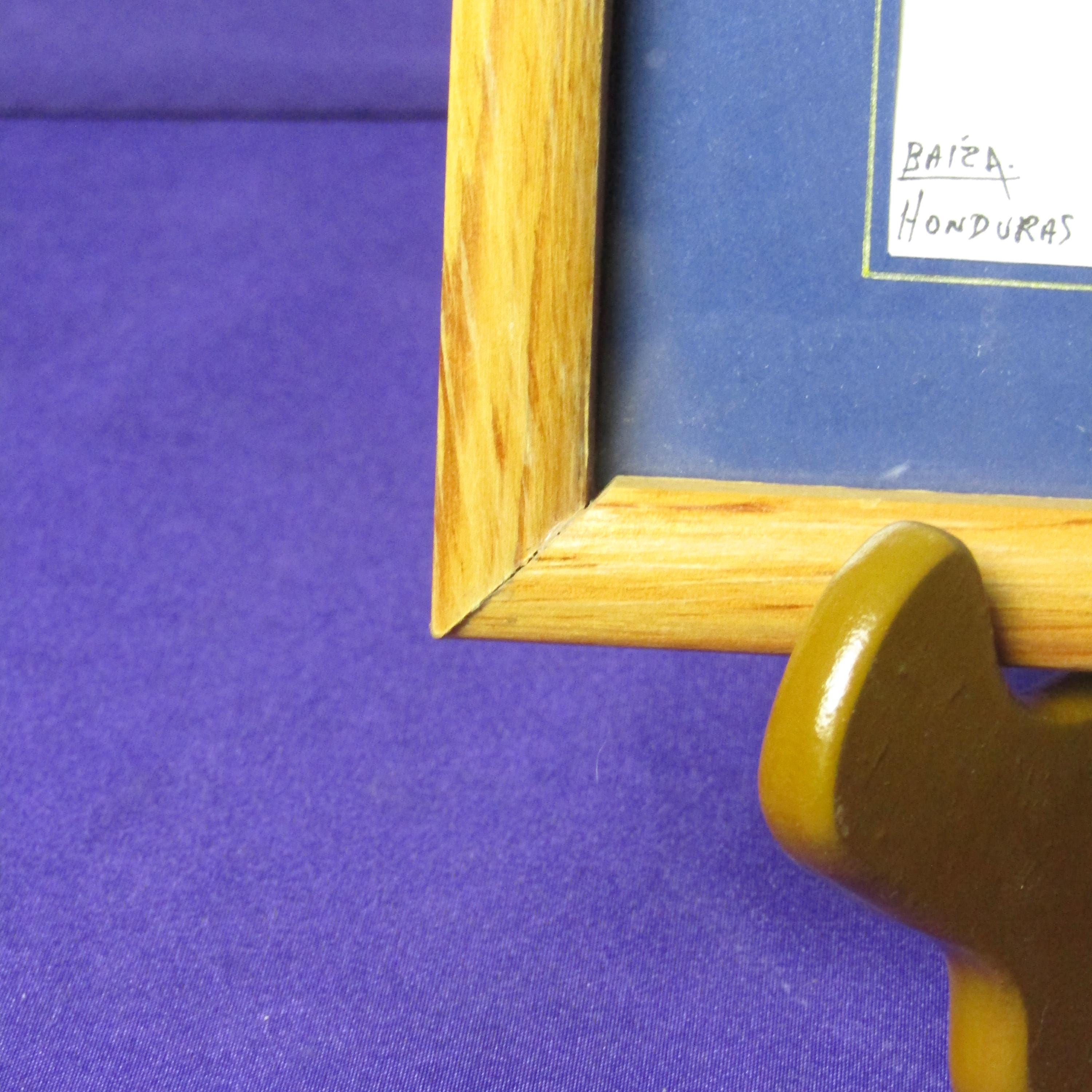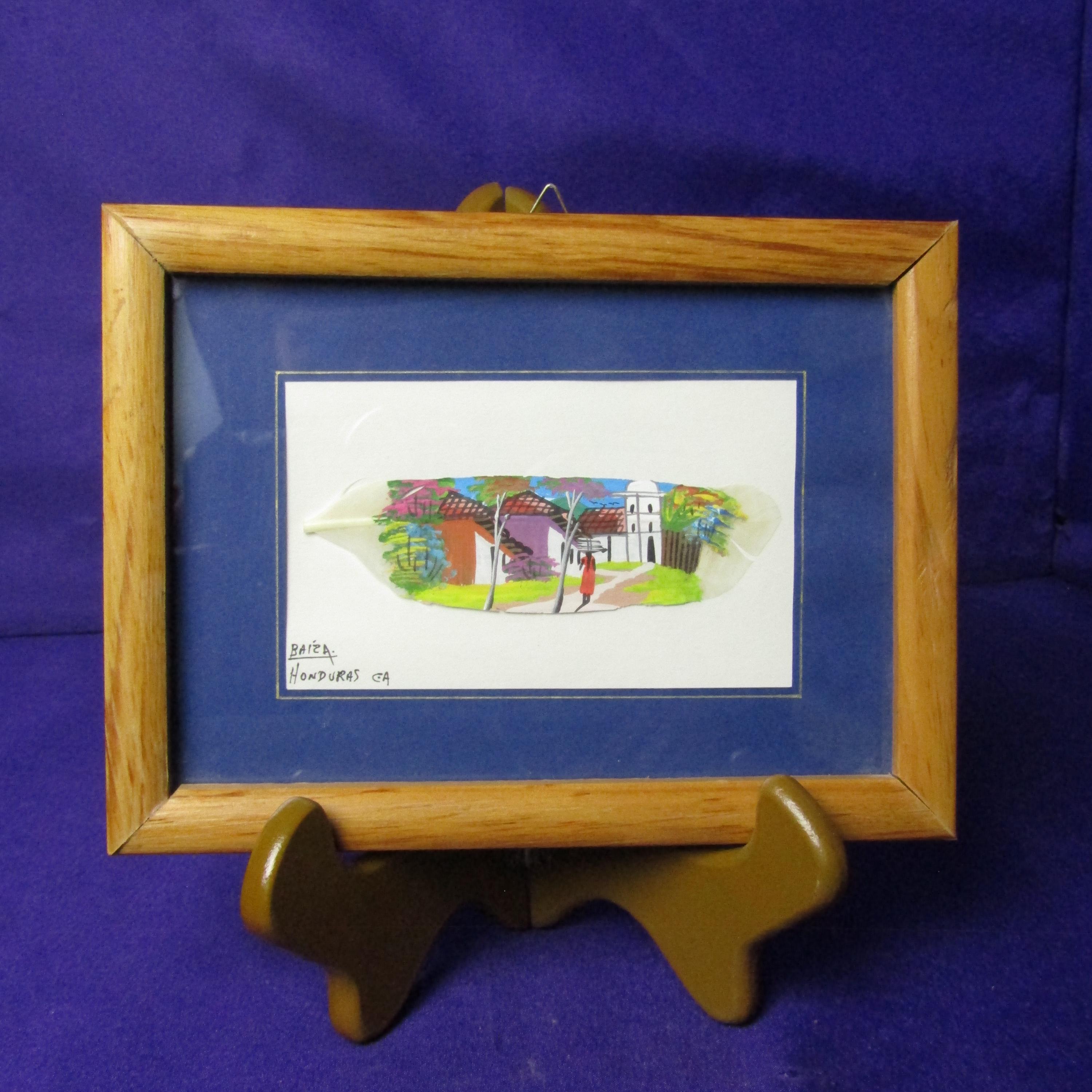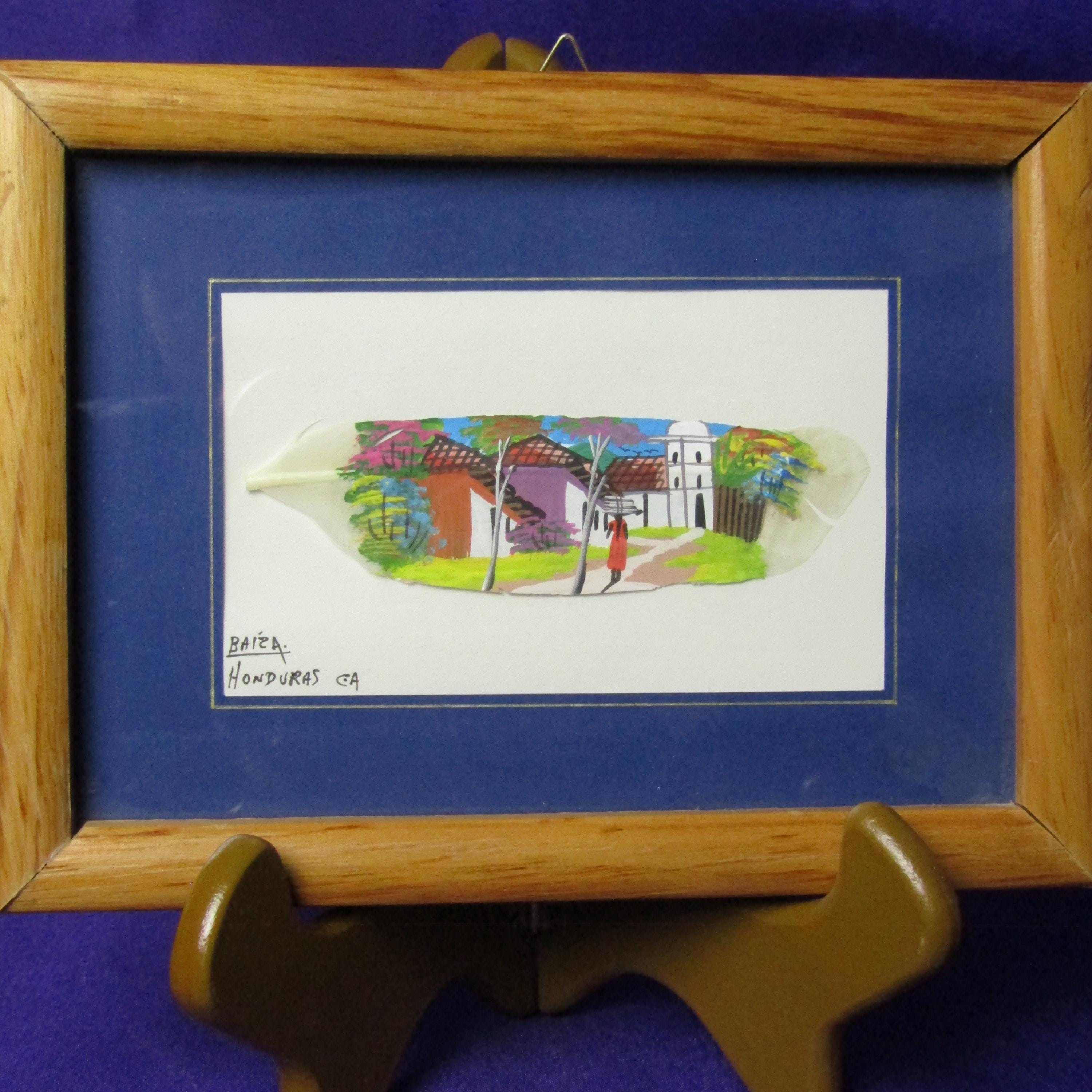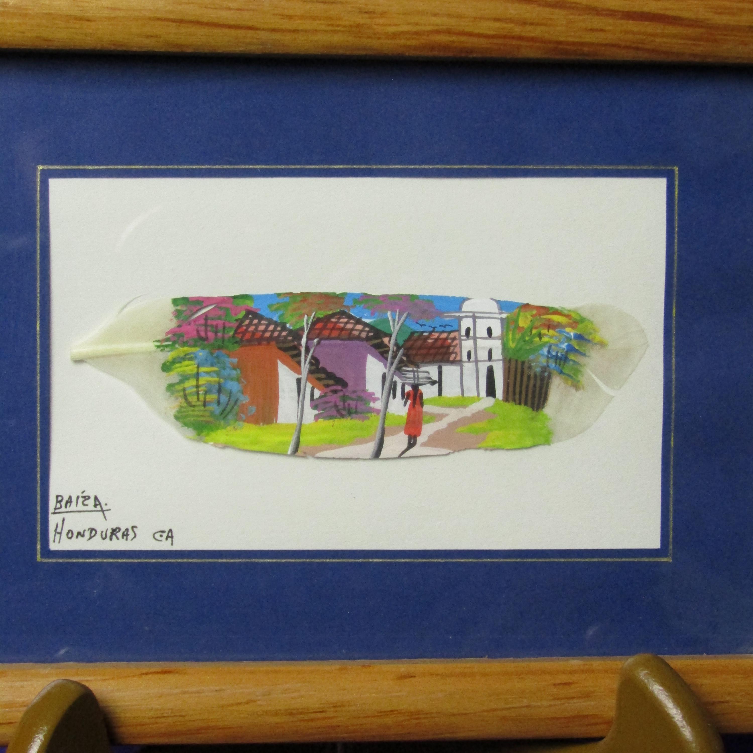 This unique art piece features a natural bird feather delicately adorned with a hand-painted scene of a figure walking gracefully with a jug balanced on their head. The painting uses bright and vivid colors that contrast beautifully against the feather’s white organic texture, coming together to create a gorgeous blend of nature and artistry. Fine details bring movement and character to the small-scale composition, making it a captivating display piece despite its delicate size. In the corner, the artwork notes that it was made in Honduras and includes the word “Baiza,” though we are unsure whether or not this is the artist's name. With its smaller size it would make the perfect shelf or desk decoration, or perhaps its placed among other art pieces on the wall! Both cultural and visually distinctive, this feather painting is a memorable and conversation-worthy addition to any collection.