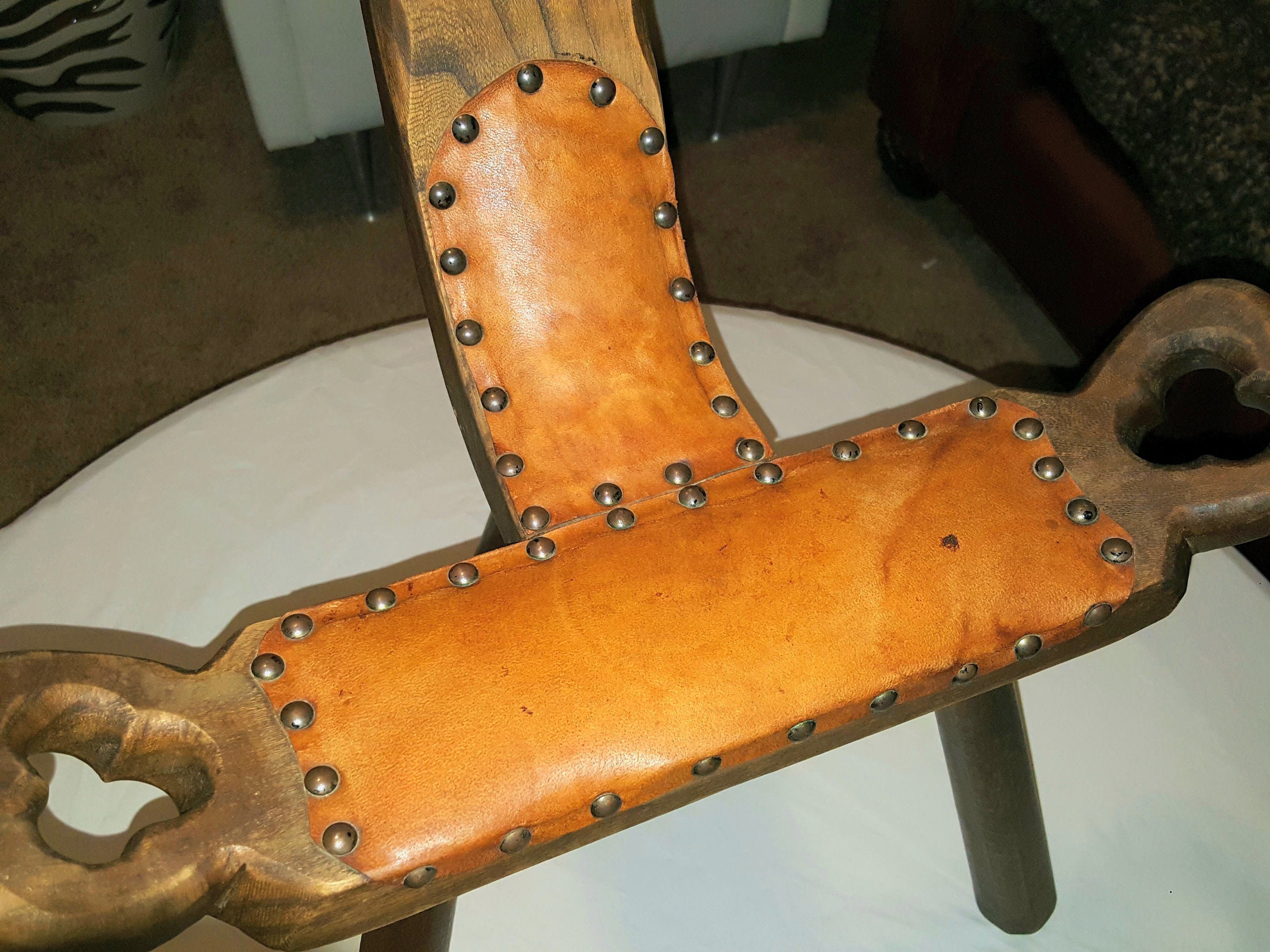 This early 20th century carved birthing chair is made of solid wood. Featuring carved handles on the upper chair rail and on the sides of the saddle-style seat. A quatrefoil is carved into the chair's back and saddle ends. The chair seat is covered in brown leather with leather going up partway along the back and decorated with rounded nail heads