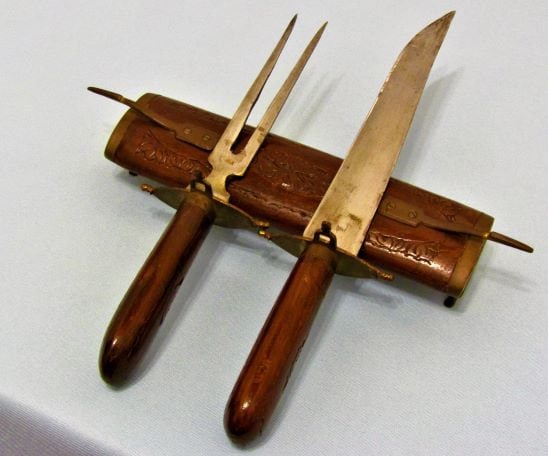 The piece is in noticeably antiquated condition with the knife having a slightly loose hilt but still usable for carving when sharpened. Given its age, the set makes a wonderful piece of decor and curio.
