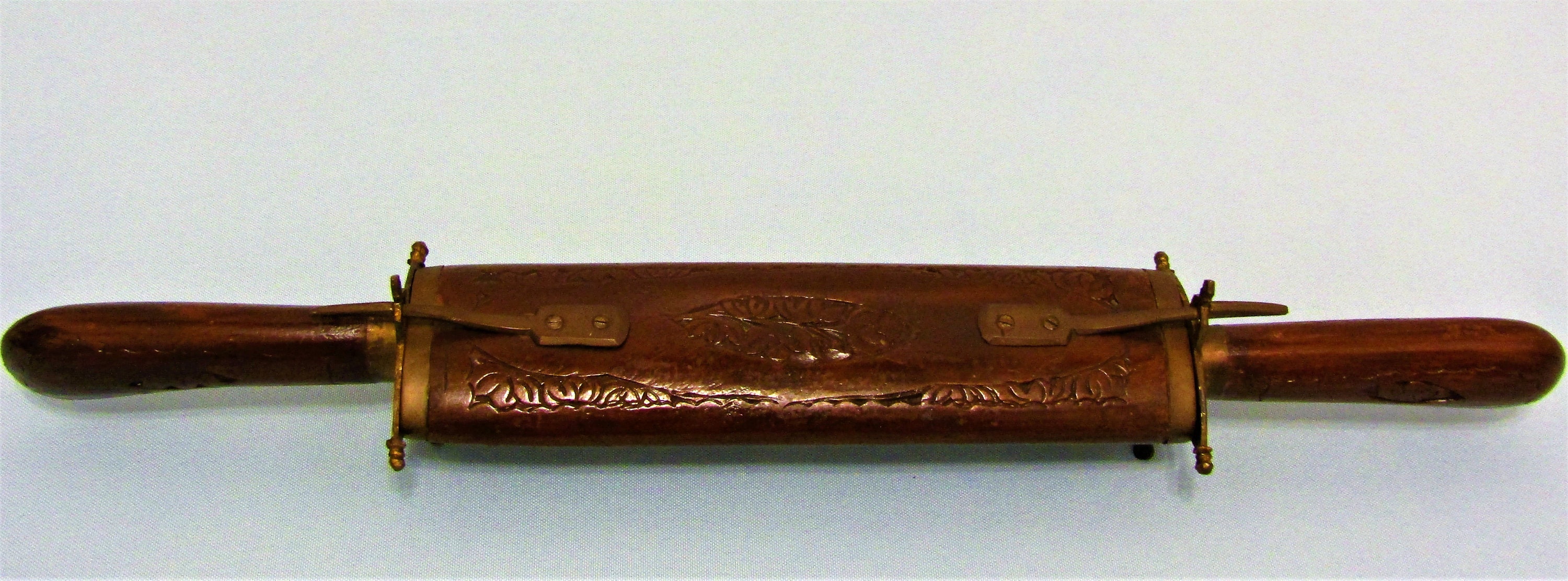 Available for purchase from Pimbleberry is this vintage carving set featuring ornate carved wooden designs and brass metalwork. Displays and stores nicely in a decorative hand-carved wooden sheath atop four brass feet and secure brass hardware. The Steel Fork and knife are marked India.