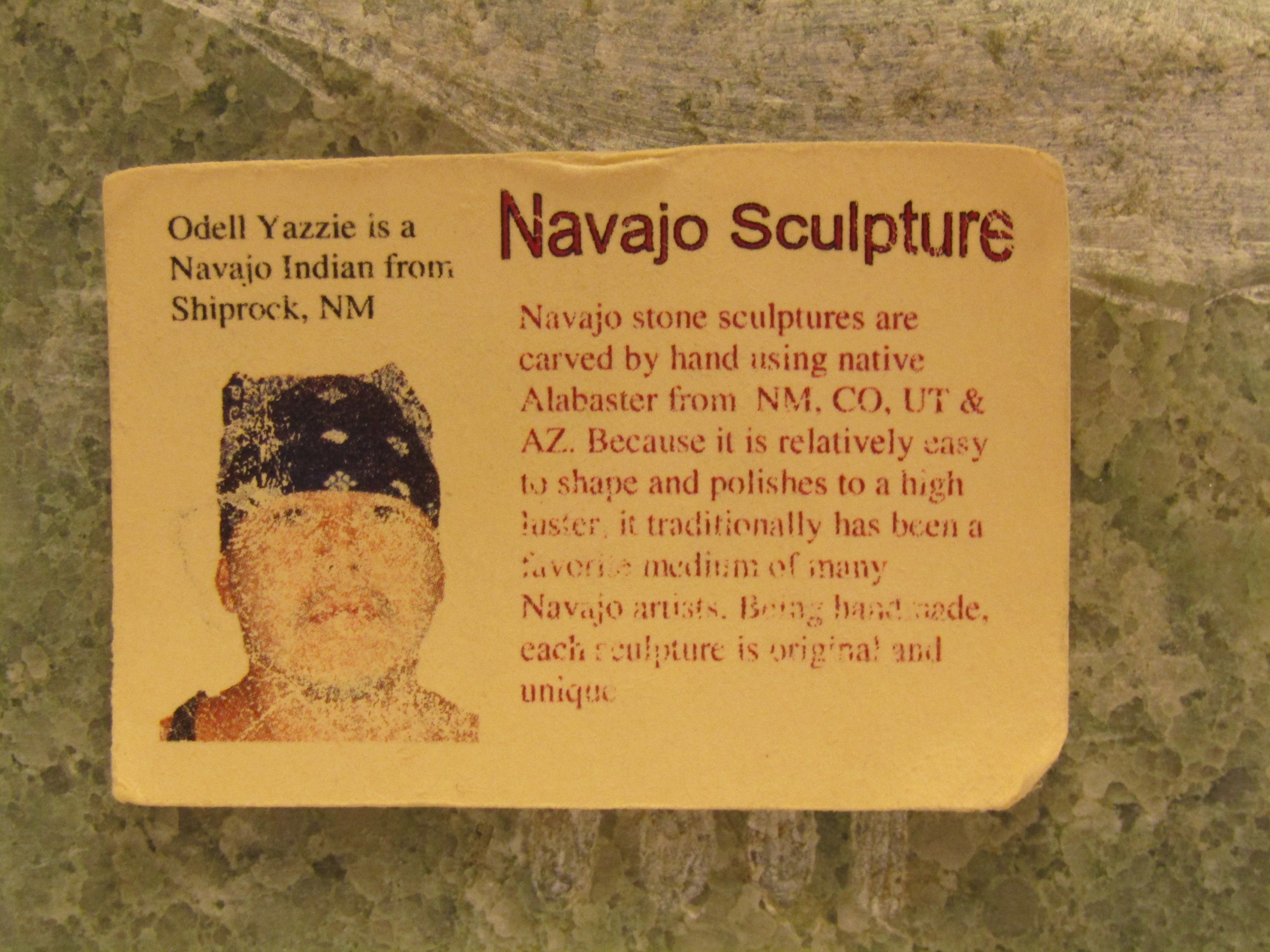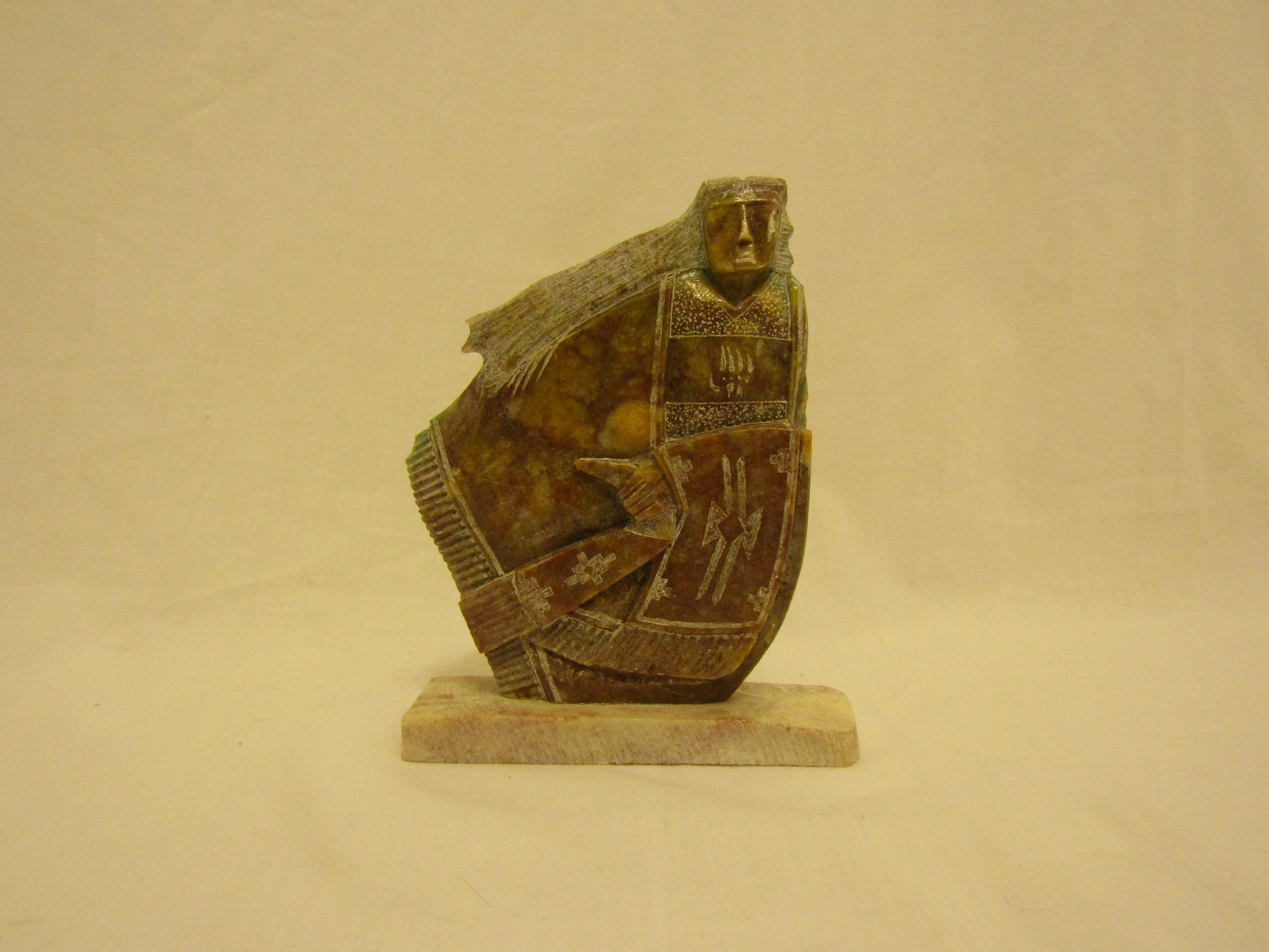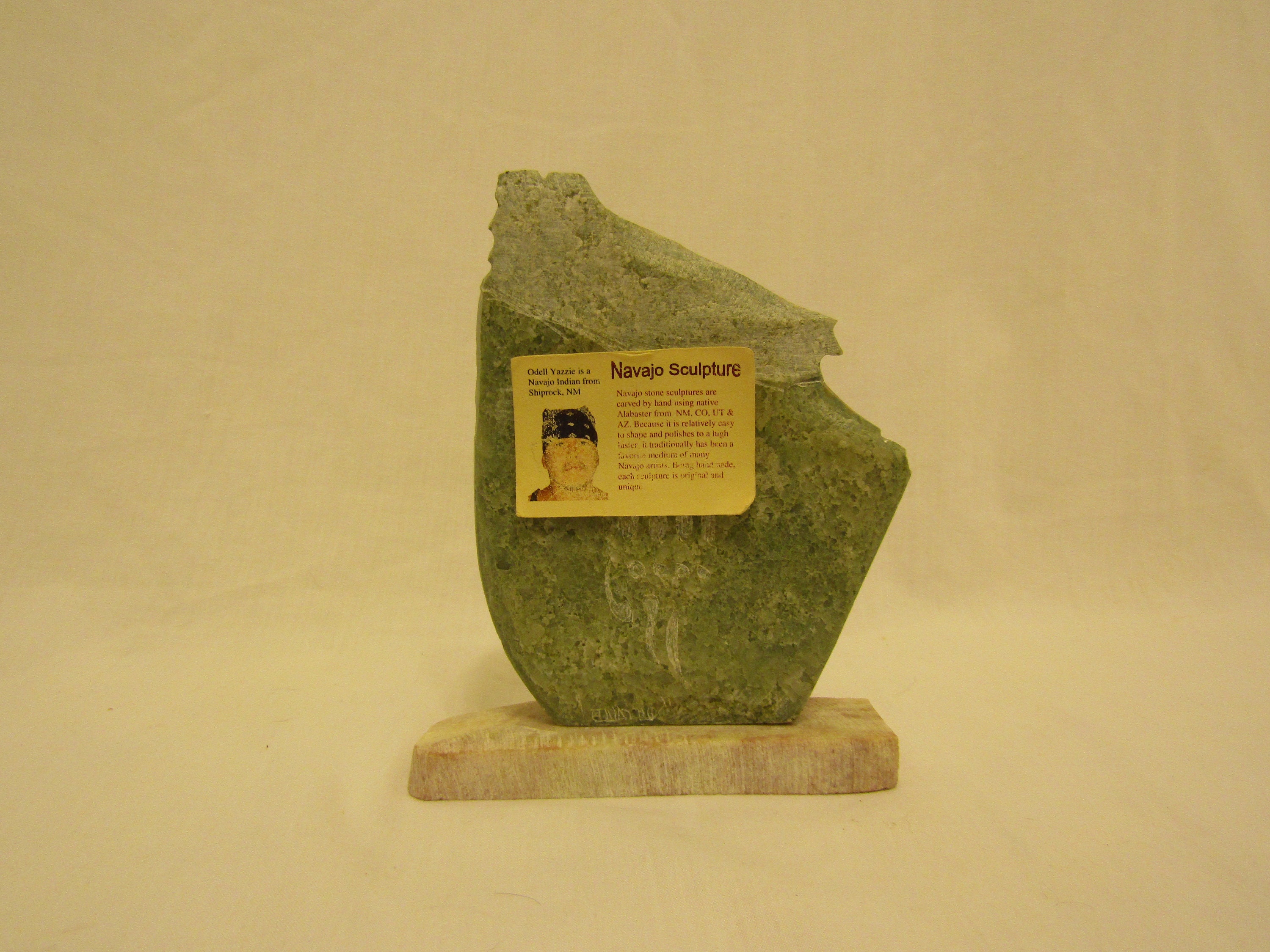 This sculpture depicts a Native American with flowing hair and robes holding a prayer fan. The hand carved sculpture was created in New Mexico of local alabaster by the Navajo artist Odell Yazzie. The alabaster is beautifully carved and polished and displays deep colors of red rust with green and golden splashes throughout.
