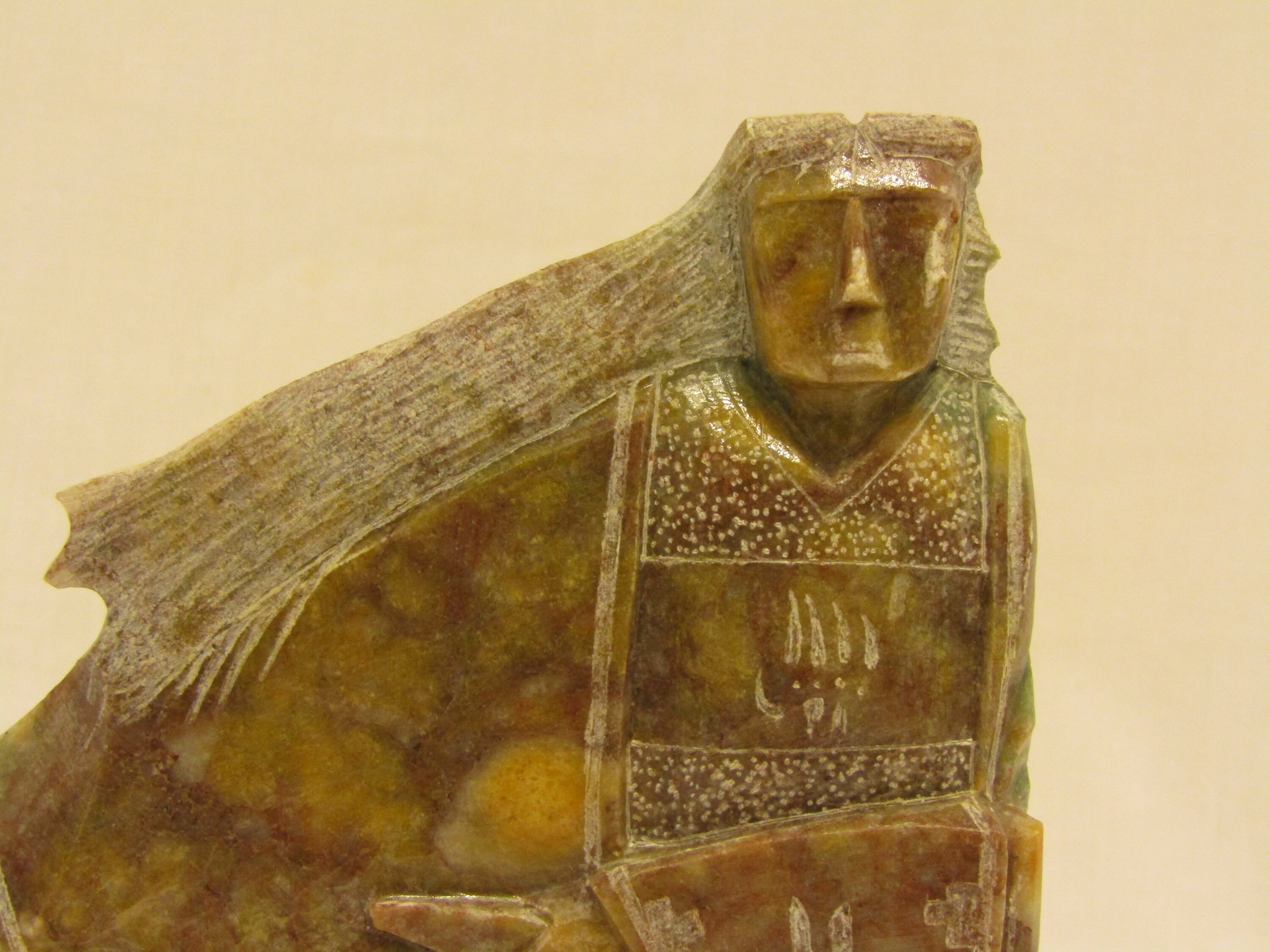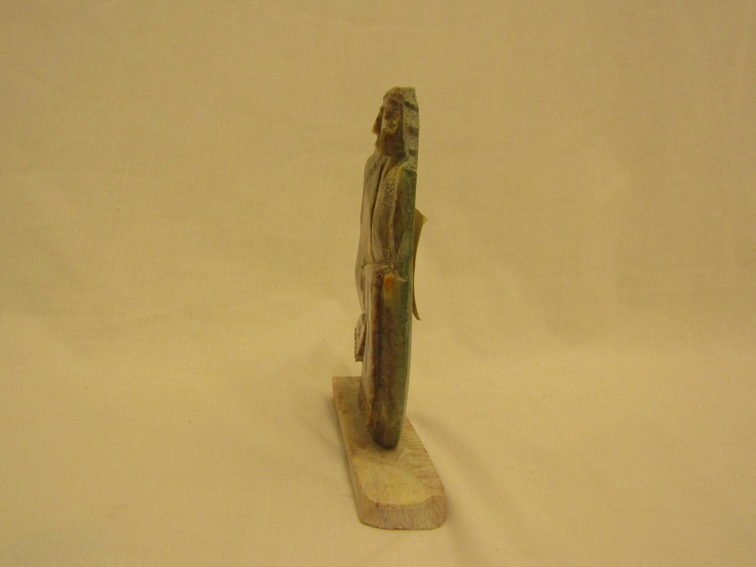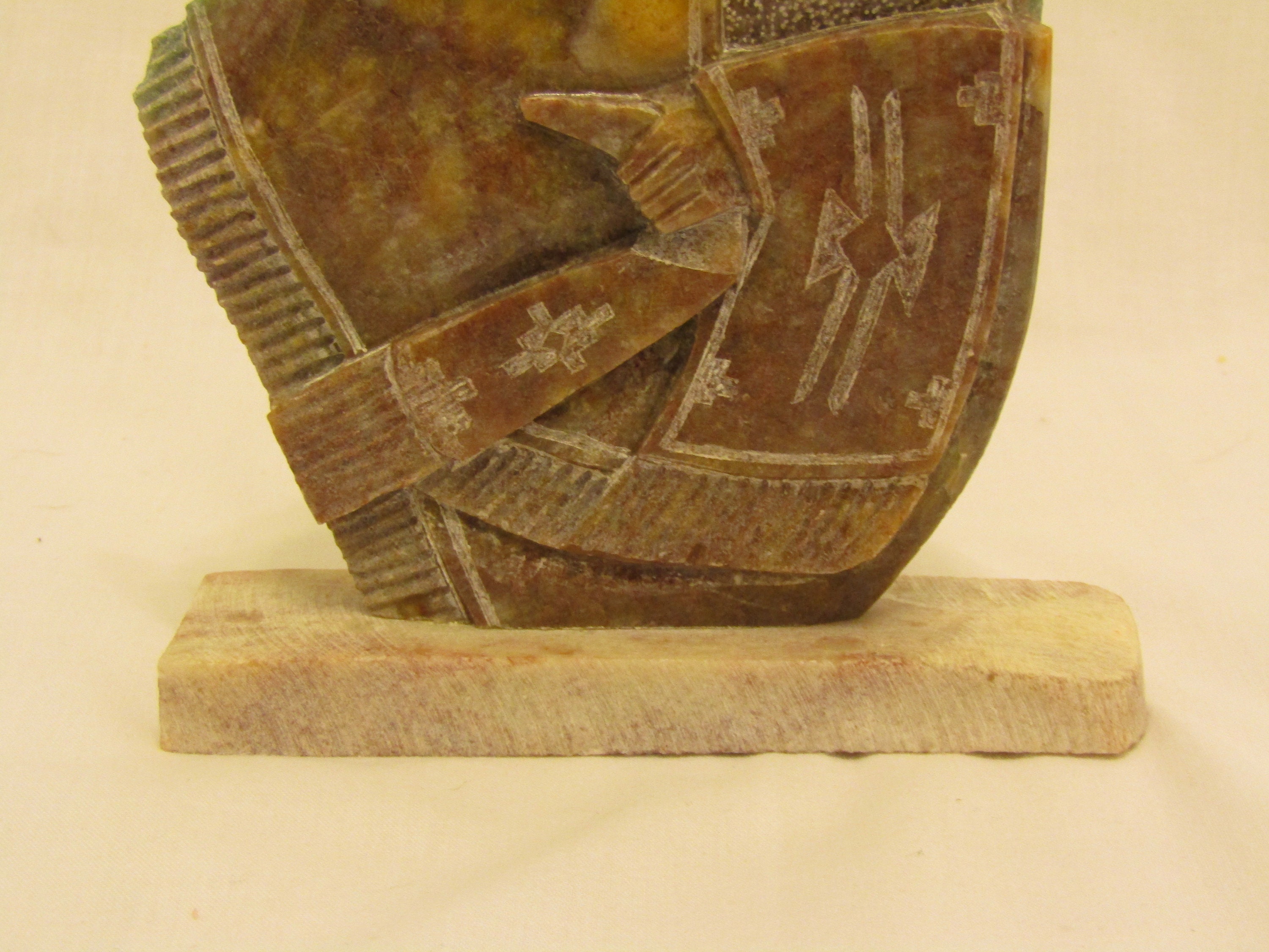 This sculpture depicts a Native American with flowing hair and robes holding a prayer fan. The hand carved sculpture was created in New Mexico of local alabaster by the Navajo artist Odell Yazzie. The alabaster is beautifully carved and polished and displays deep colors of red rust with green and golden splashes throughout.